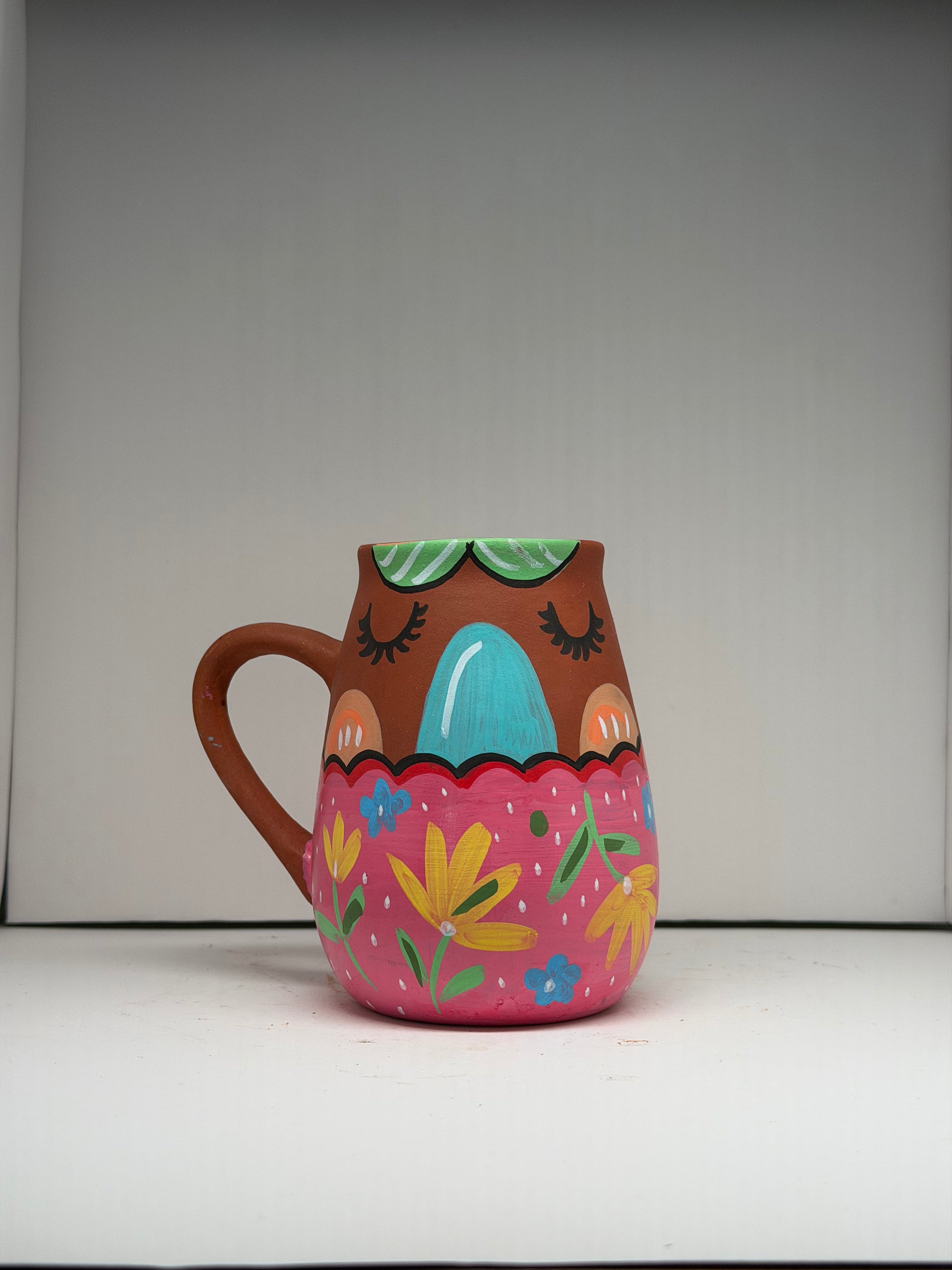 No. Unglazed terracotta mugs should not be washed in a dishwasher, as high temperatures and strong detergents can harm the material and any hand-painted detailing.